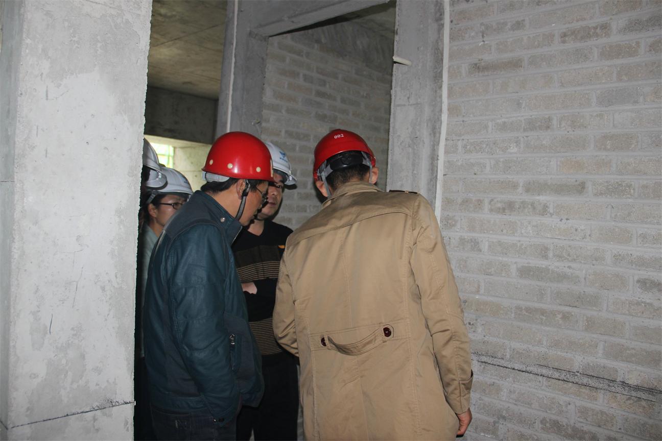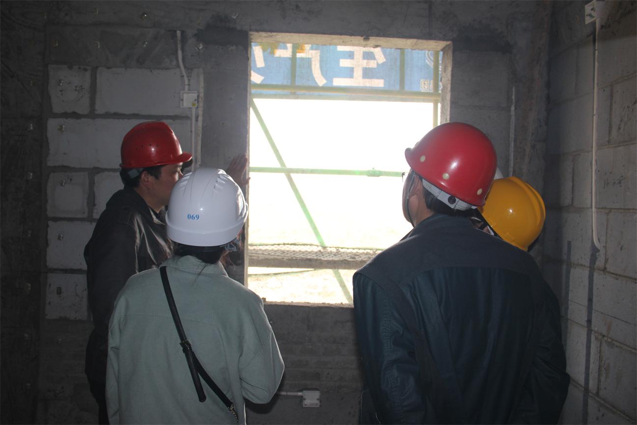 (图为听取讲解员进行墙体的砌筑、灰缝的控制,抗裂网格布的铺设、窗台四周素混凝土包裹的做法以及砌块喷砂等质量做法)