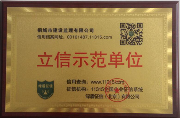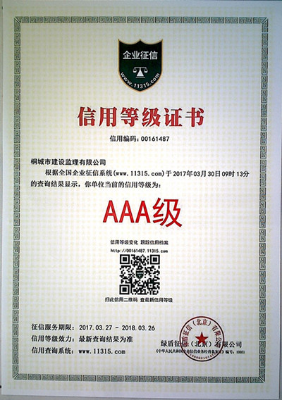 2017年3月30日,我公司凭借过硬的综合实力,诚信经营的宗旨理念,经过11315全国征信系统对我公司的多项资质、企业规模、纳税情况、社会认可度等的审核,最终被认证为“AAA级信用等级单位”,这是我市建筑业行业首次获得该项荣誉。