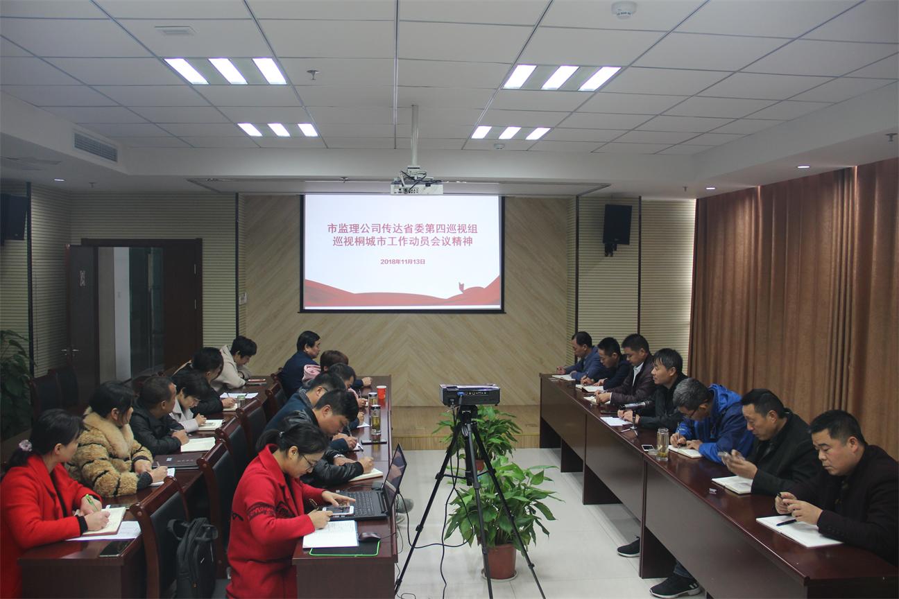 11月13日上午,市监理公司召开会议,传达省委第四巡视组巡视桐城市工作动员会议精神,汪海元总经理主持会议,班子成员及二级机构人员参加会议。