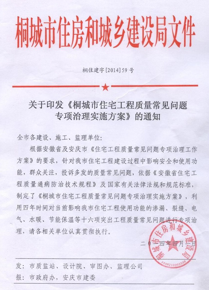 (局发)关于印发《桐城市住宅工程质量常见问题专项治理实施方案》的通知