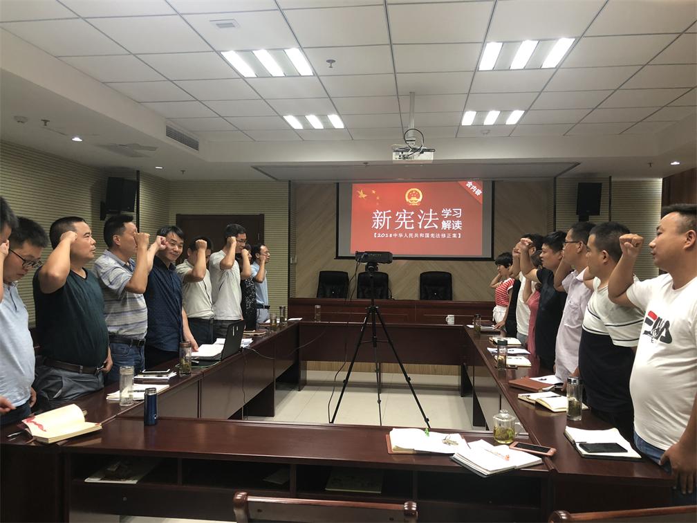 会议首先由汪海元总经理带领与会人员集体向宪法宣誓,然后利用PPT的形式全面学习新宪法的具体修改内容。
